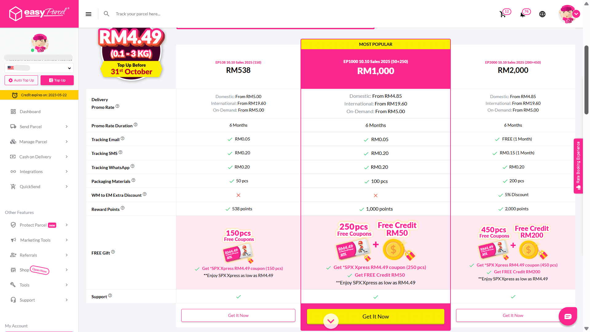 By simply making a new top up of EasyParcel Special Deal packages from 10th – 31st October2025, you can receive free credits and the amount depends on the packages.