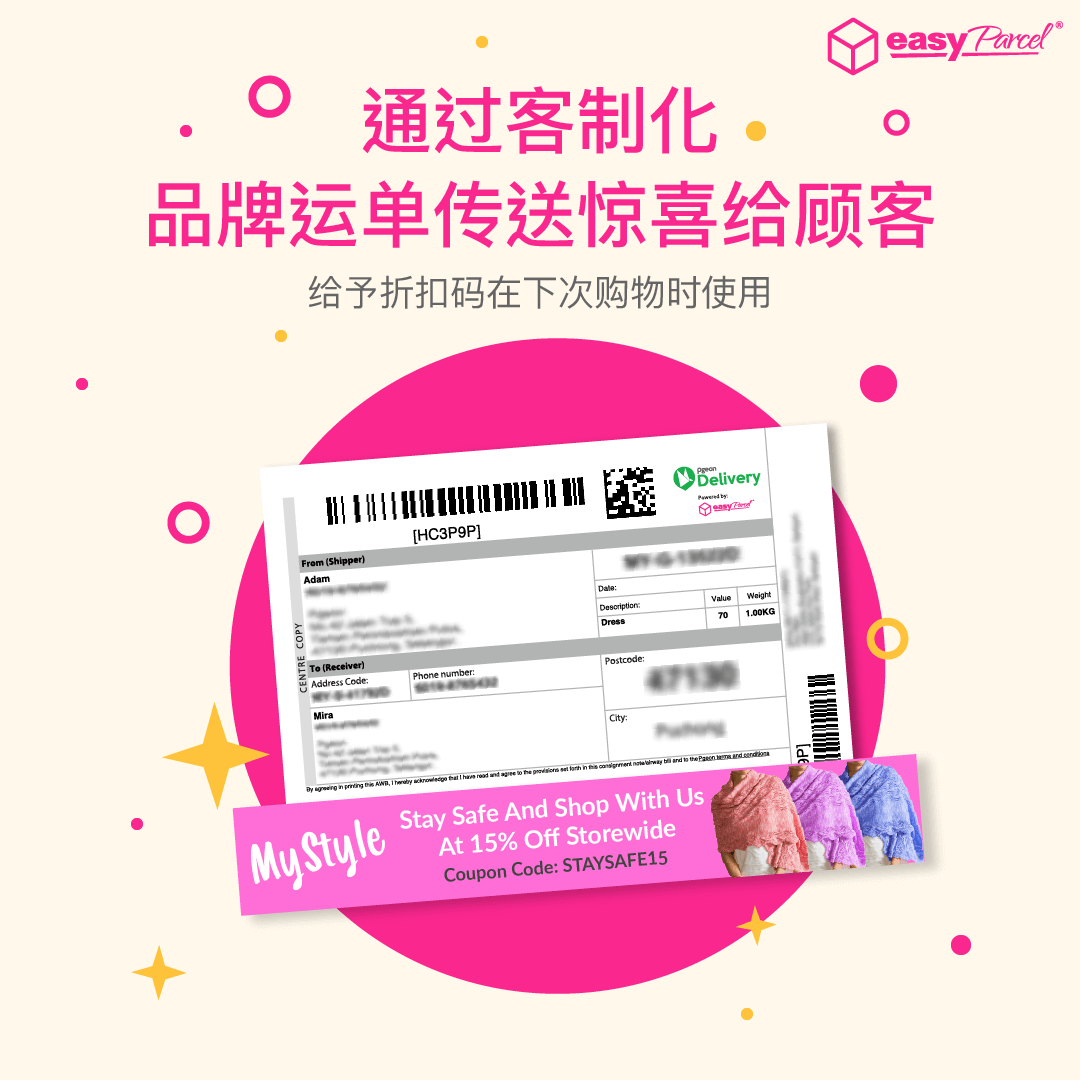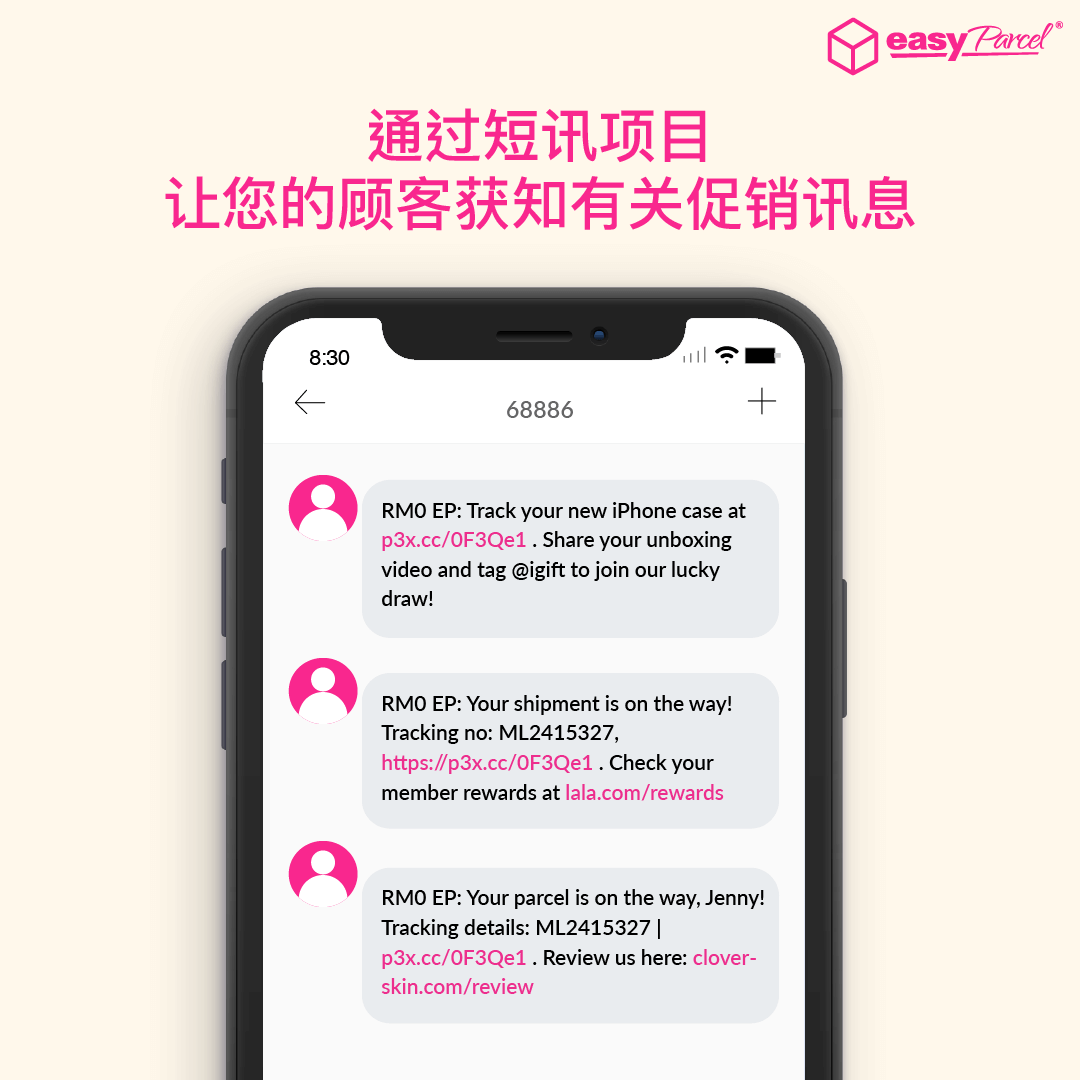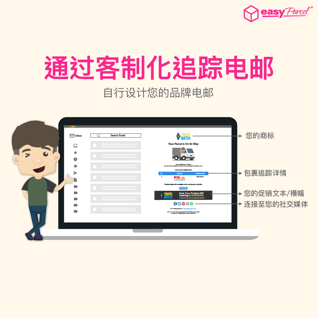 您是否知道,吸引新顾客对比保留现有顾客的成本要高5-25倍呢? 因此,我们EasyParcel推出了营销工具来让顾客继续爱你的品牌,甚至在9.9促销后继续跟您复购,例如:客制化追踪短讯客制化追踪电邮短讯项目客制化品牌运单客制化品牌EasyTrack。 不如尝试一下,然后在社交媒体上与我们分享您的喜悦!