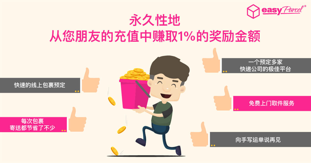 终身免费的充值金额不断注入您的账户内,怎么样呢? 通过我们的推荐活动,我们可以让您梦想成真。 邀请朋友在EasyParcel进行注册,您可以从他的每次充值金额中获得1%的EasyParcel充值金额,而且是无限循环!