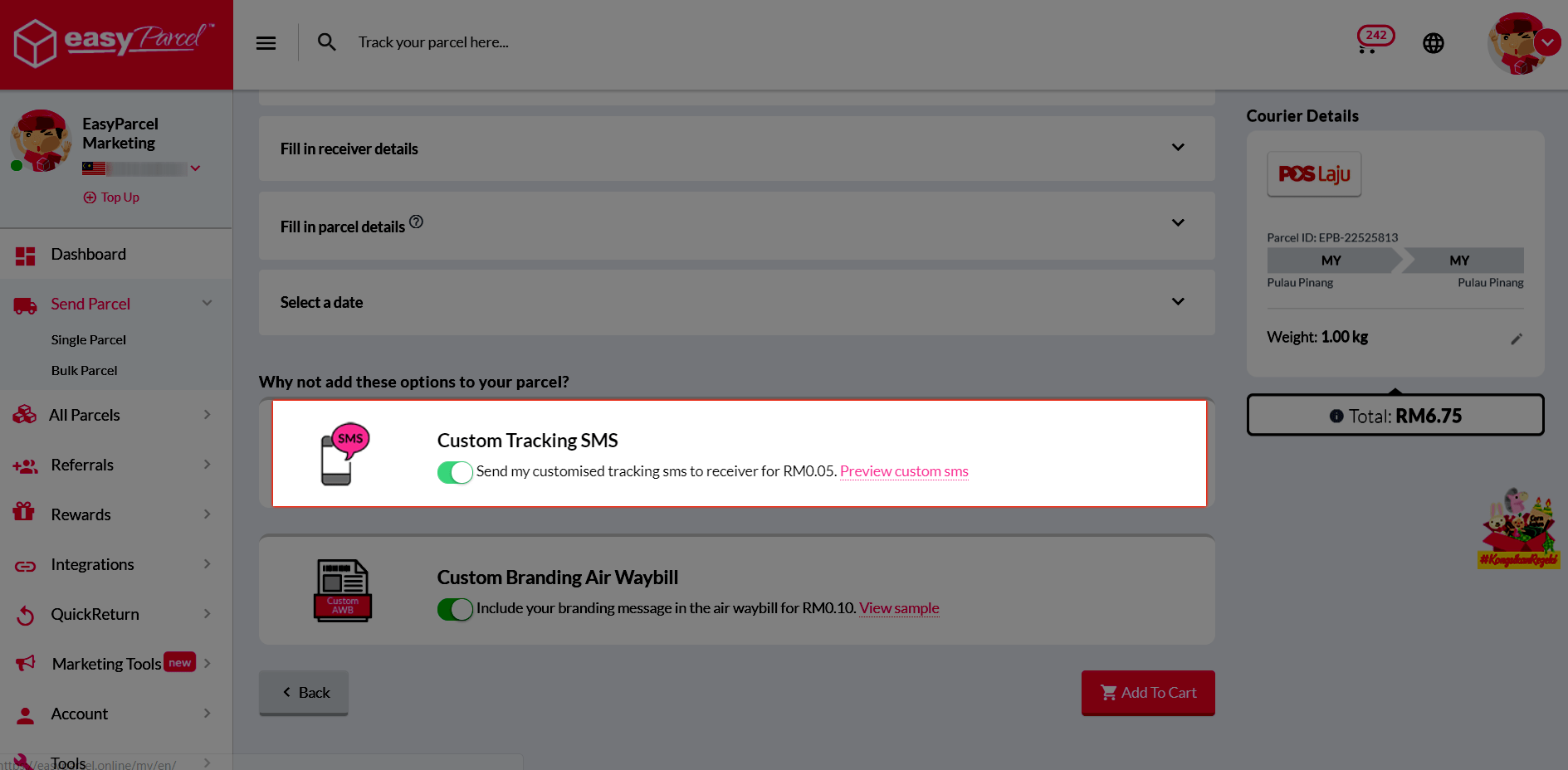 Step 5: Once the Custom Tracking SMS has been activated, all you need to do is just turn on “Custom Tracking SMS” when booking for courier service.
