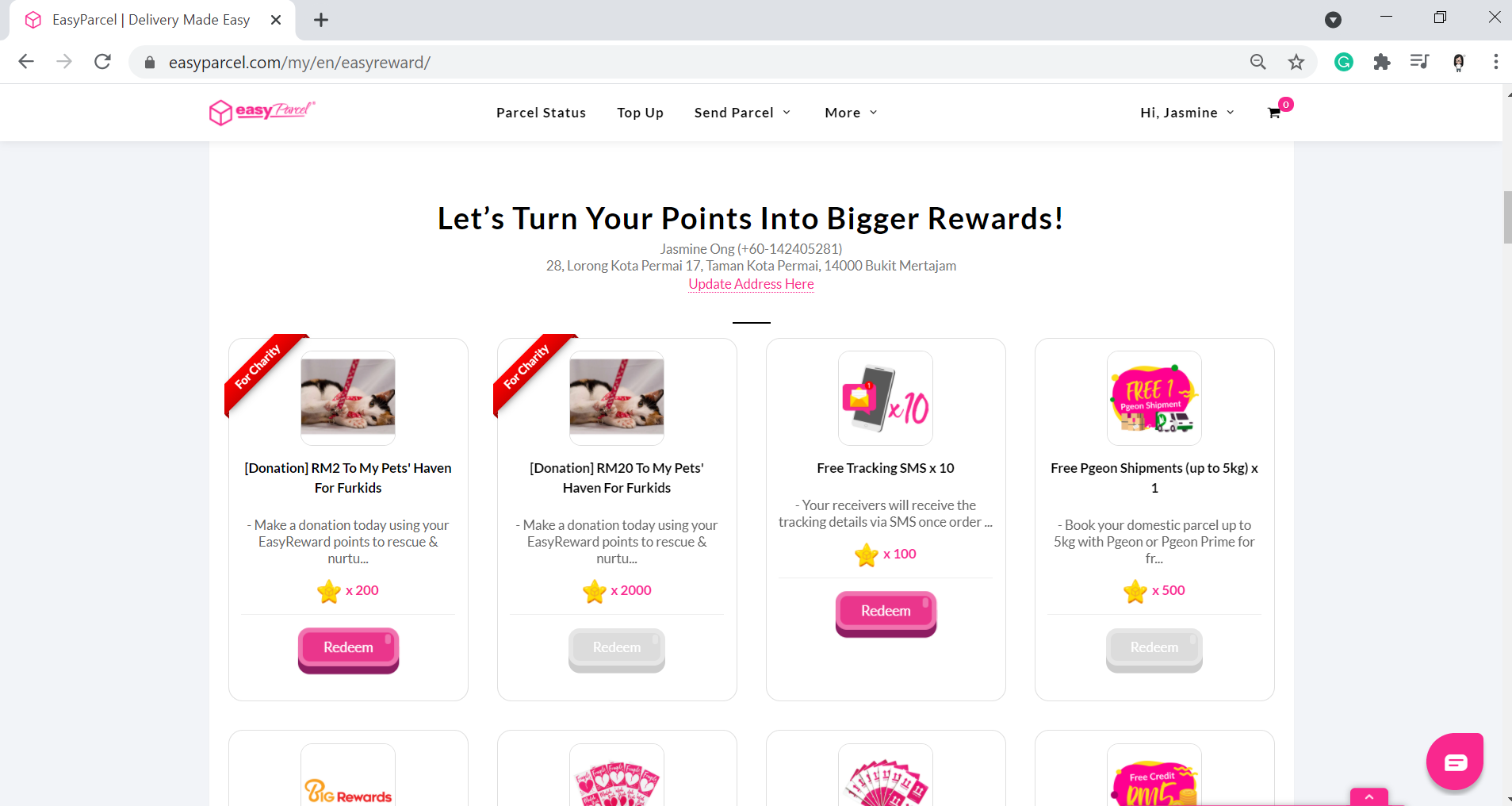 Gunakan serendah 200 mata EasyReward untuk menebus [Donation to My Pets’ Haven For Furkids] yang disediakan dalam halaman EasyReward dan kami akan menukar mata EasyReward anda kepada nilai RM2 untuk sumbanganKami juga menyediakan pilihan untuk menggunakan 2000 mata EasyReward kepada sumbangan RM20!