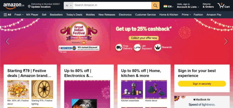 Amazon India is the largest e-commerce platform in the country, offering nationwide reach, trusted logistics, and millions of active buyers. Its wide product range, Prime membership benefits, and advanced seller tools help businesses gain strong visibility and build customer trust.