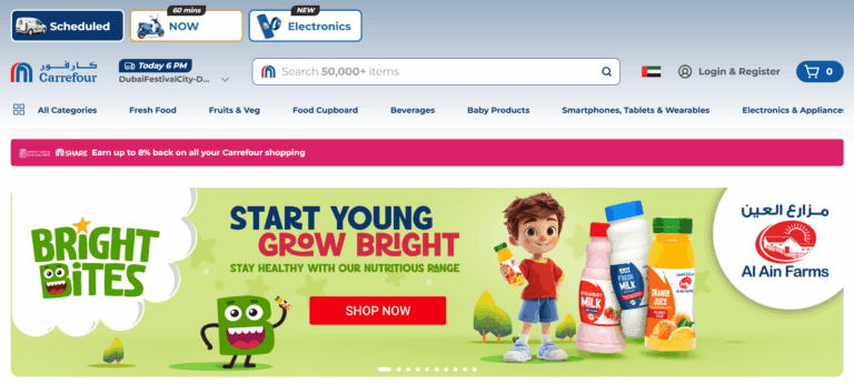 Carrefour’s online platform is ideal for grocery, household, and daily essentials. Sellers choose it because it offers trusted service, click-and-collect, and fast delivery options, giving access to a loyal, convenience-seeking customer base.