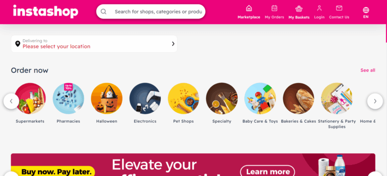 Instashop focuses on groceries, essentials, and pharmacy products, letting customers order directly from nearby stores. Sellers choose it to reach local buyers quickly and benefit from on-demand delivery, increasing sales for fast-moving items.