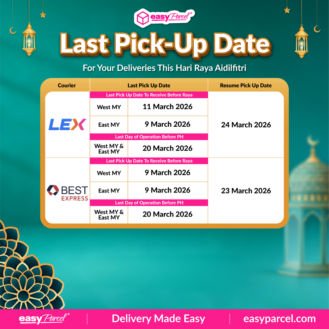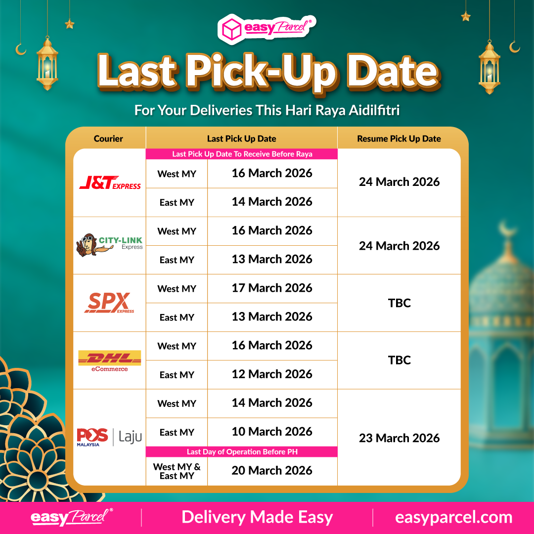 Important Notice: To ensure your Raya parcels arrive in time for the festivities, please be advised that our courier partners nationwide will be observing a holiday break. We strongly encourage all EasyParcel users to plan ahead and refer to the last pickup and delivery dates listed below. Scheduling your shipments early is the best way to avoid the festive peak-season surge and ensure a smooth delivery experience.