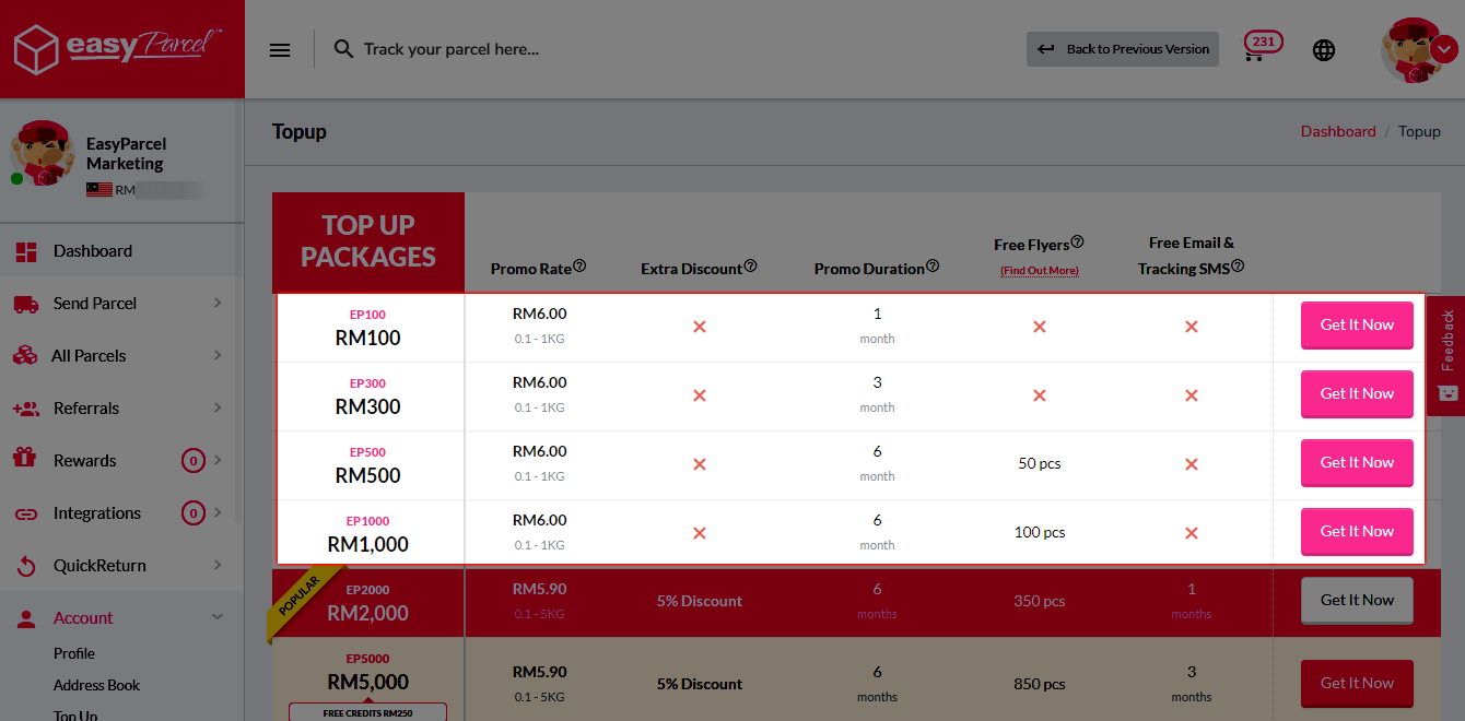 Select EP100 – EP1,000 top up package on EasyParcel.