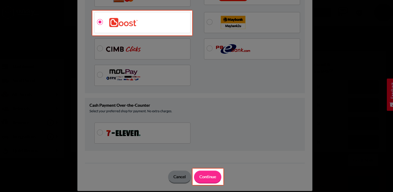 STEP 2: When comes to payment method, choose “Boost” and click on “Continue” to proceed