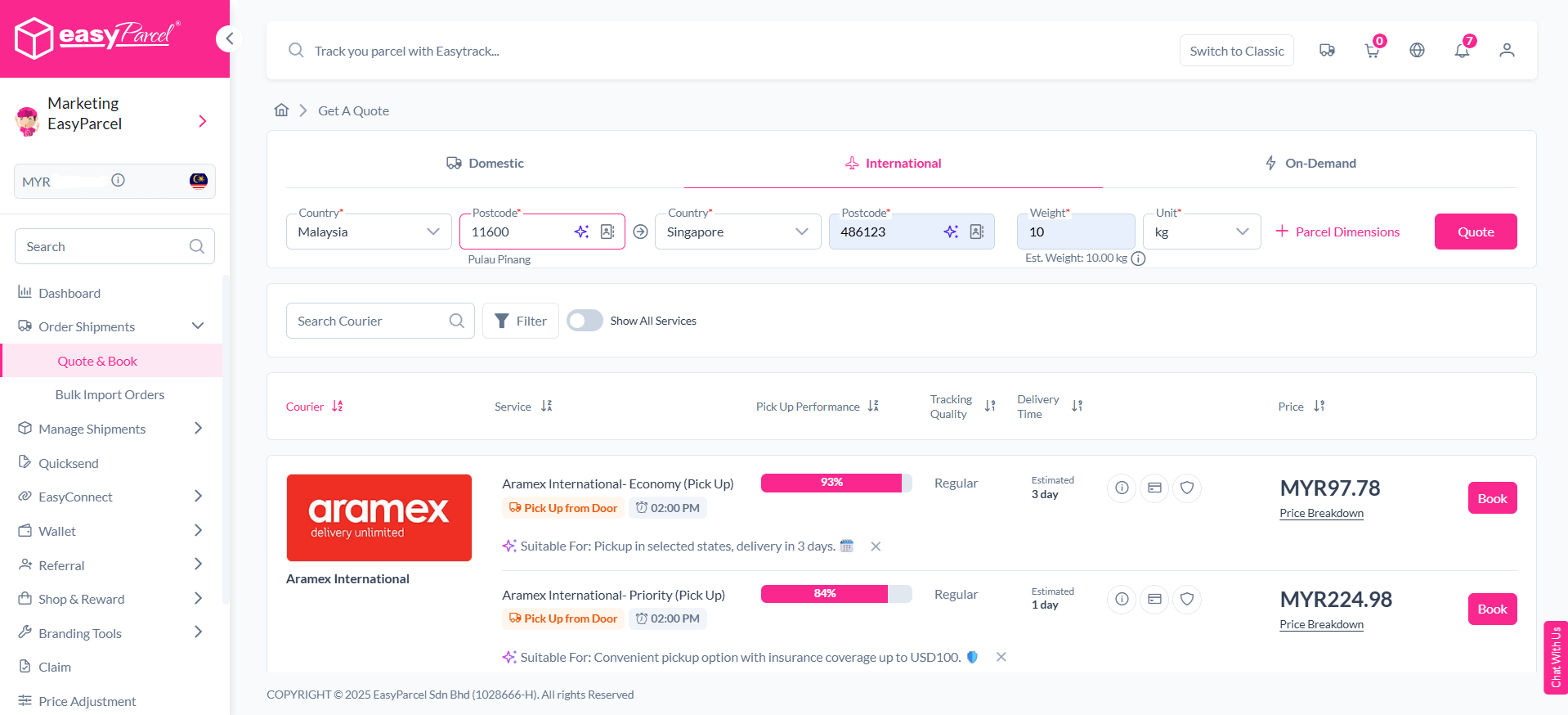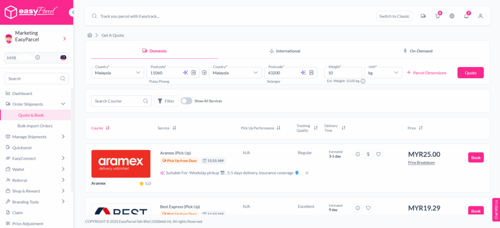 The Quote & Book feature is the heart of EasyParcel Next Gen. It allows you to quickly compare courier prices, delivery times, and service options — all in one place. Whether you’re sending a single parcel or managing multiple shipments, this feature helps you find the best delivery option instantly.