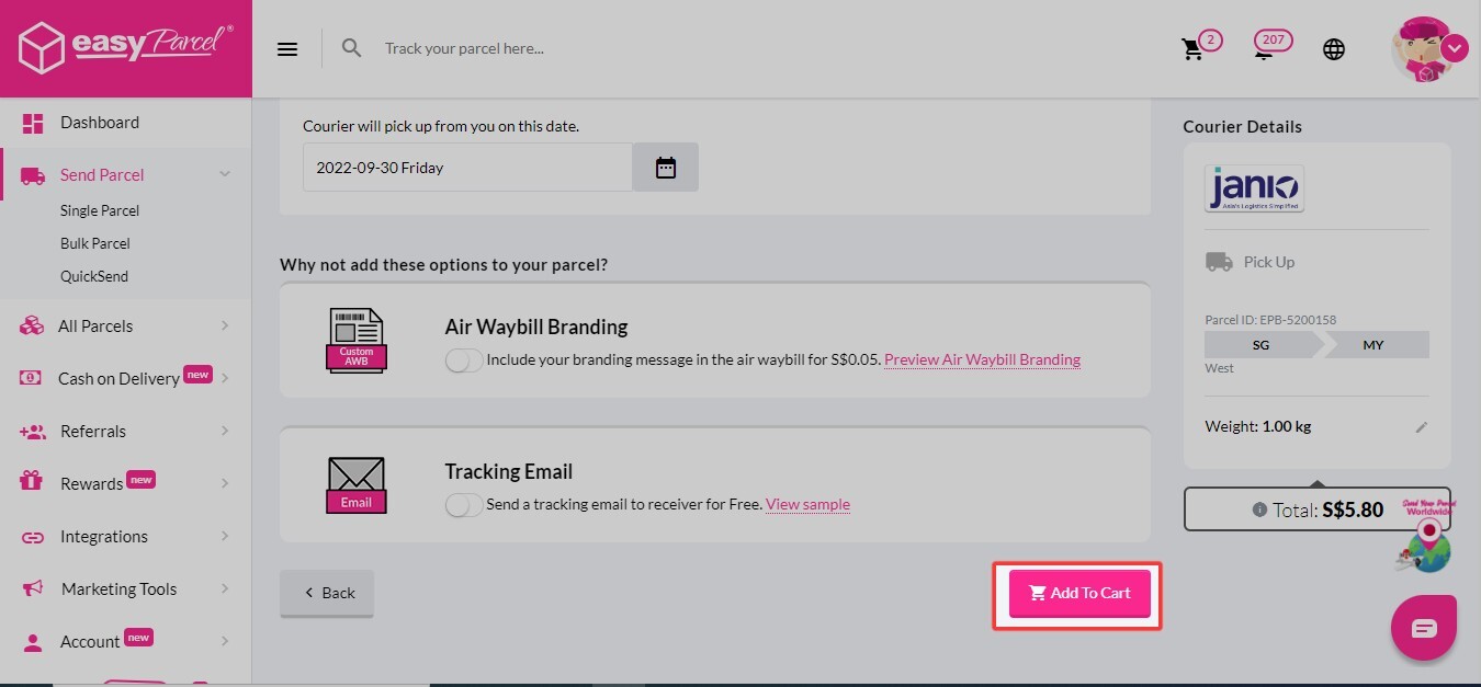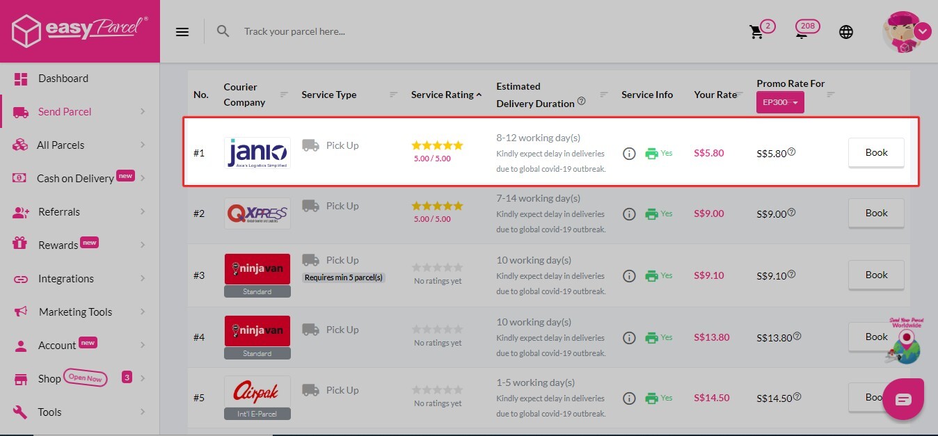 Step 3: Choose Janio to ship your parcels, and hit ‘Book’.