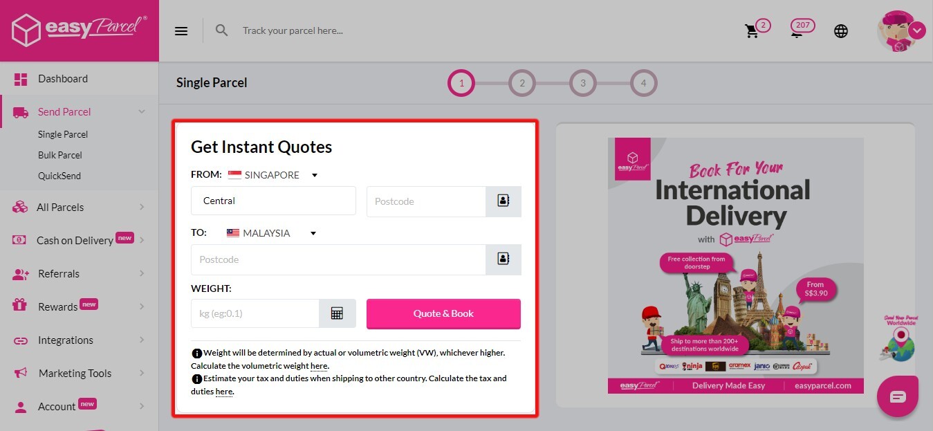 Step 2: Go to ‘Single Parcel’, key in parcel destination and hit ‘Quote and Book’.
