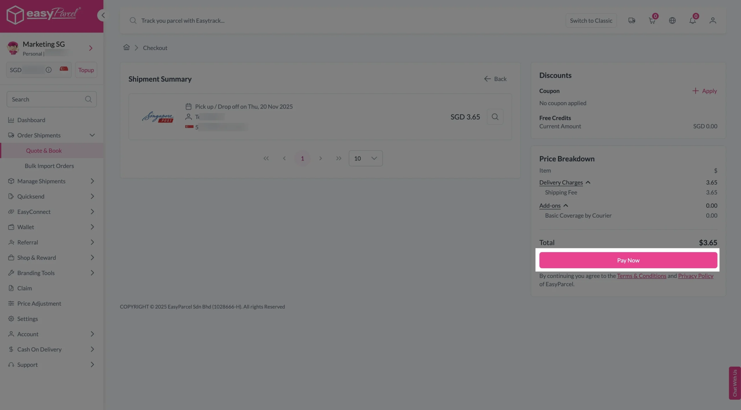 - Click “Pay Now” with EasyParcel credit to complete your booking.