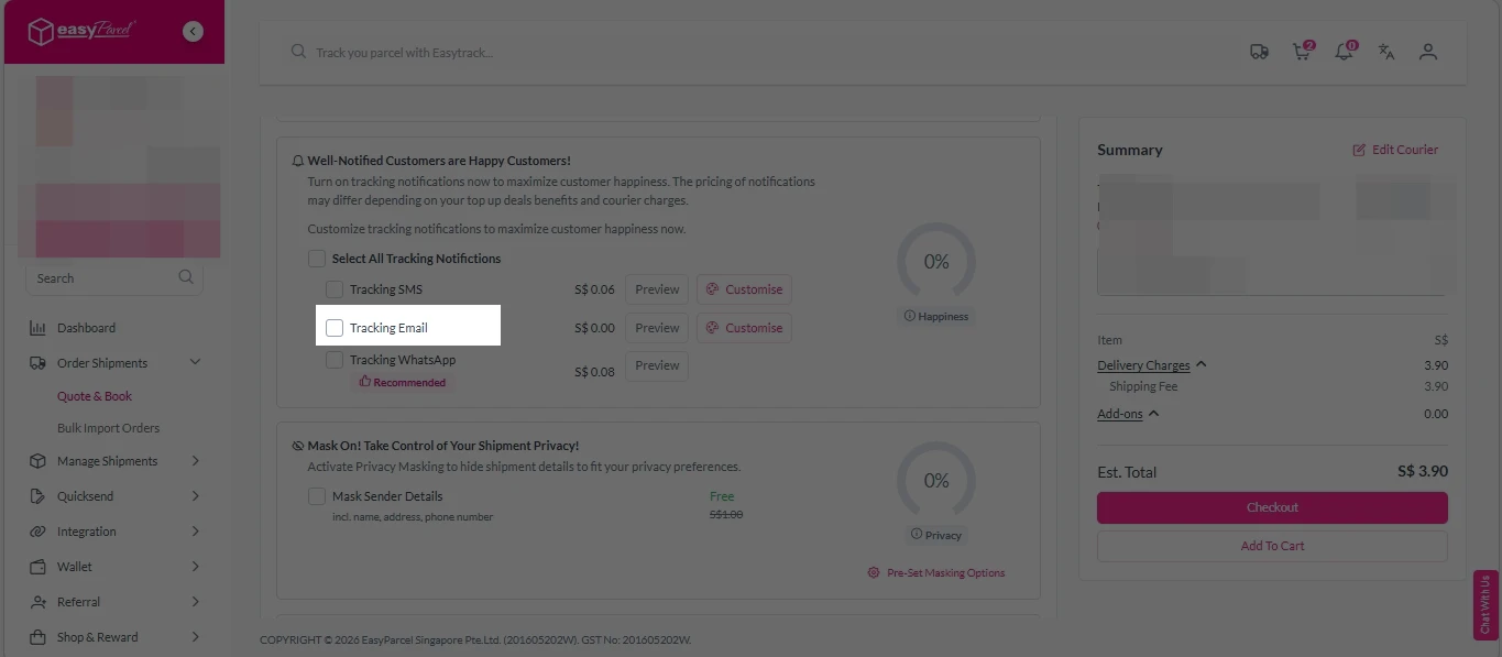 Tracking Email is an automated notification tool that informs your receivers of the tracking number for every parcel you book through EasyParcel . Instead of sending generic, boring emails, you can customize the message with: