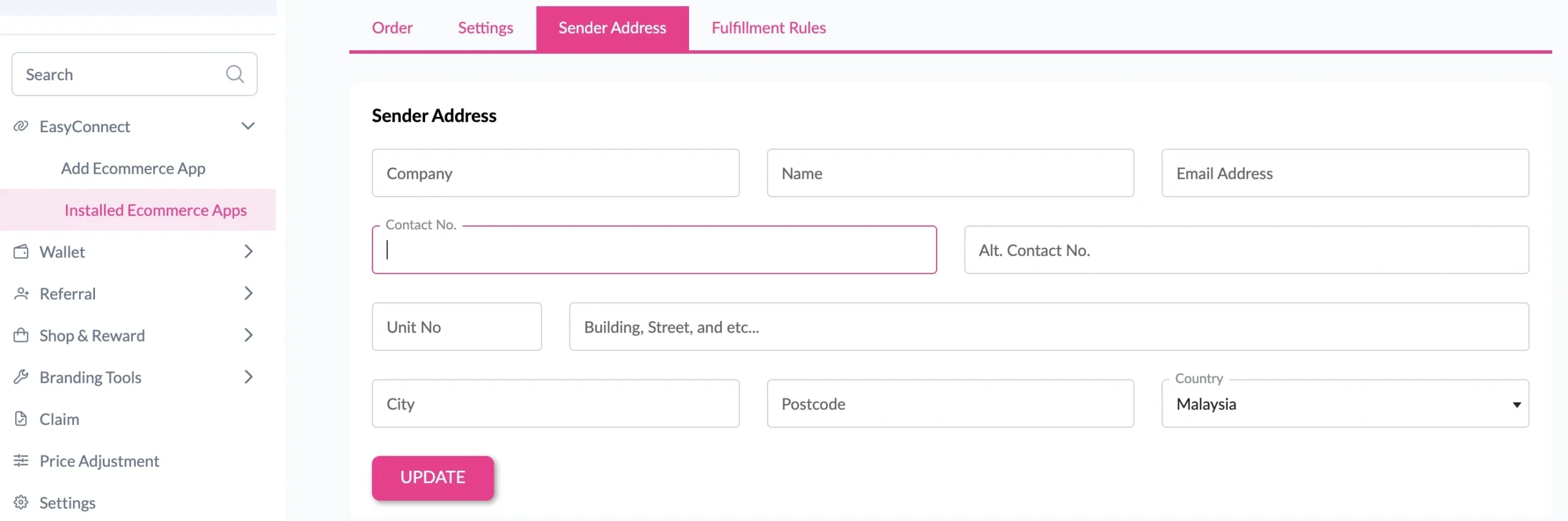 Step 2: In the store, click “Sender Address” and key in your sender details and click on the “Update” button.